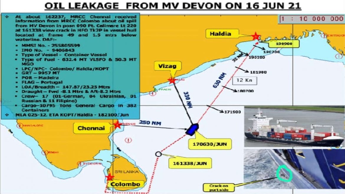 The Indian Coast Guard (ICG) received information from MRCC Colombo in late hours of Thursday regarding a mid-sea oil spill about 450 Km South East of Chennai. On further investigation, it was revealed that a Portugese Flag Container ship MV Devon on passage from Colombo to Haldia (West Bengal), developed an underwater crack in the left side fuel tank containing about 120 KL of Very Low Sulphur Fuel Oil (VLSFO).