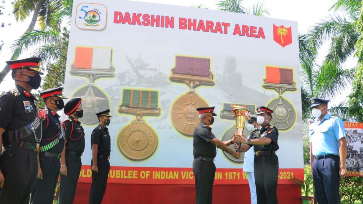 The Victory Flame of Swarnim Vijay Varsh, commemorating the 50th anniversary of India’s victory in the 1971 war, was received by Commanding Officer, 231 Transit Camp, Andaman and Nicobar Command (ANC) Col Gyan Pandey on behalf of ANC in Chennai. The Victory Flame, after covering 3,000 km on the mainland, is scheduled to travel 700 nm (1300 km) in the sea onboard the Indian Naval Ship Sumedha and reach Port Blair. On reaching Port Blair, the Flame will be received by the Lieutenant Governor, A&N Islands, Admiral (Retd) DK Joshi who would then hand it over to Commander-in-Chief, Andaman and Nicobar Command (CINCAN) Lieutenant General Ajai Singh for the conduct of commemorative activities under the aegis of ANC.